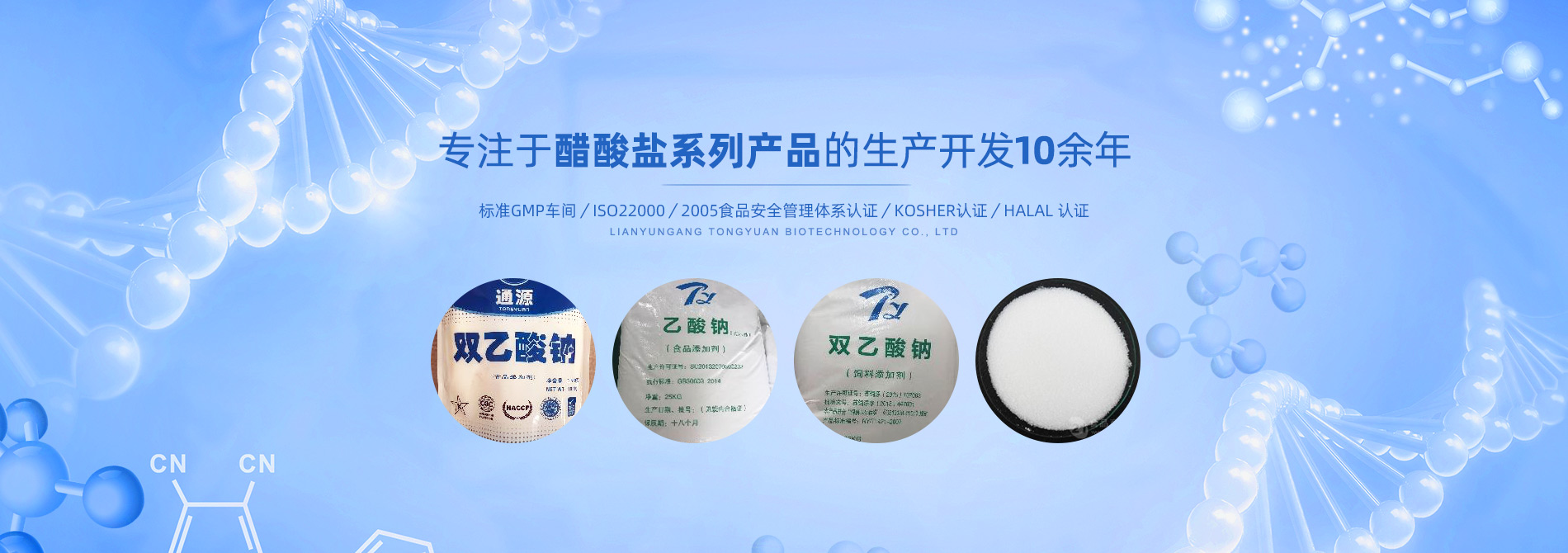 連云港市通源生物科技有限公司 是生產(chǎn)雙乙酸鈉、無水醋酸鈉、三水醋酸鈉、醋酸鉀、乙酸鈉、丙酸鈉、丙酸鈣和氯化鉀等系類醋酸鹽產(chǎn)品的專業(yè)制造商。公司專注于醋酸鹽系列產(chǎn)品的生產(chǎn)開發(fā)10余年,是國內(nèi)專業(yè)醋酸酸鹽產(chǎn)品生產(chǎn)基地?! ∧壳?,我們已和全球30多個國家和地區(qū)建立長期的業(yè)務(wù)合作關(guān)系,是中國較大的雙乙酸鈉生產(chǎn)商和出口商之一。作為中國食品添加劑和配料協(xié)會理事單位,通源公司已建成標(biāo)準(zhǔn)GMP車間5000余平方米,通過了ISO22000:2005食品安全管理體系認(rèn)證、KOSHER認(rèn)證、HALAL 認(rèn)證等,這些都是我們提供高質(zhì)量產(chǎn)品和優(yōu)良服務(wù)的前提和確保?! ∩a(chǎn)出色產(chǎn)品,提供優(yōu)良服務(wù),滿足顧客需要,是我們努力的目標(biāo)。愿和我們的朋友們攜手,共...